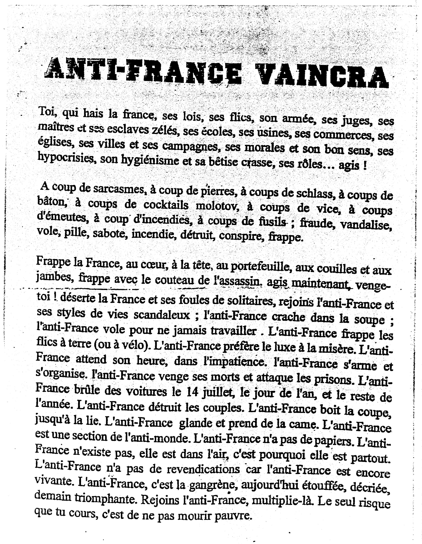 Il y a maintenant pas mal d’années je suis tombé sur un appel photocopié à l’encre venimeuse, un tract plein de rage et de poésie intitulé « antifrance vaincra » . Une sorte de cocktail molotov littéraire jeté depuis les marges à la face du monde, 25 lignes de vitriol pleines d’humour noir qui proposaient à son lectorat de s’organiser et d’agir contre la vie monotone et oppressante :