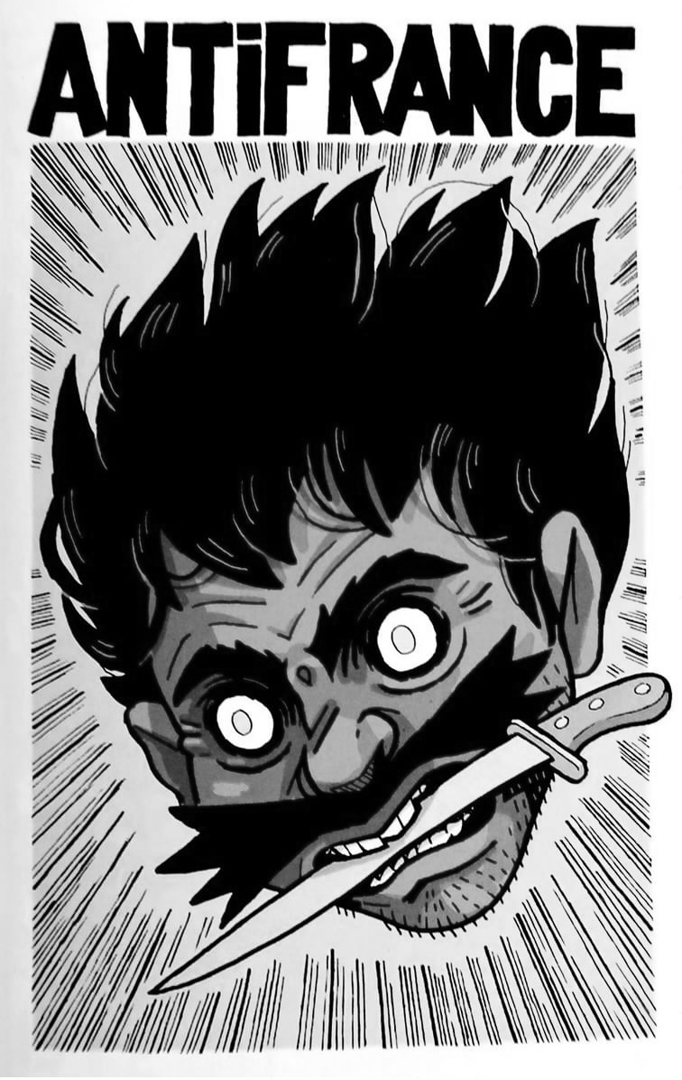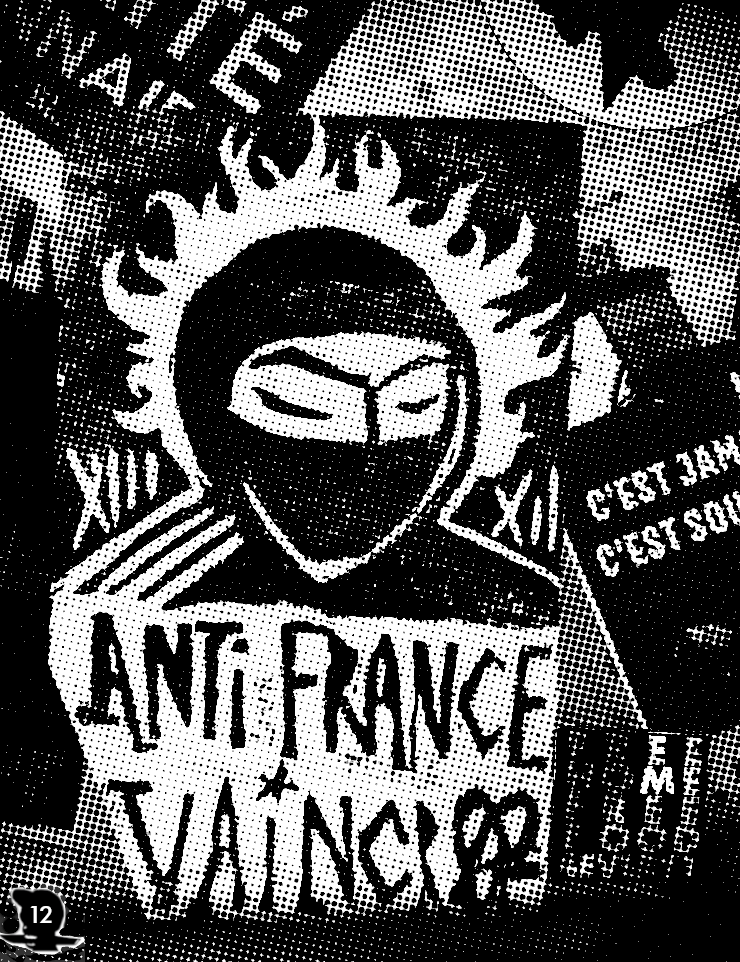 Cette vision sarcastique et détournée de l’anti-france est similaire à celle que l’on retrouve sur le tract anti-france vaincra. Tout porte à penser que la ou les personnes l’ayant rédigé ont passé du temps avec les bandes dessinées de gotlib sur les genoux, l’humour noir résonnant toujours plus fort à mesure que le système, et la france en particulier, affirmait sa nature oppressive et excluante. On se rend bien vite compte en lisant super dupont que les rangs de l’anti-france sont faits de tout ce qui ne rentre pas dans la vision idéalisée, réactionnaire et uniforme qu’impose le nationalisme. Au final, qu’on le veuille ou non et comme l’affirme le tract, l’anti-france est dans l’air, comme conséquence de la domination. Cette lutte imposée par le patriotisme est resituée dans un contexte plus global : l’anti-france est une section de l’anti-monde, ce qui implique un anti-nationalisme qui traverse la planète. L’une des qualités de l’appel repose dans cette définition diffuse du concept, l’antifrance n’existe pas mais elle est partout, elle est déjà là puisqu’on la rejoint, d’une certaine manière elle n’a pas besoin de toi mais tu as besoin d’elle: « le seul risque que tu cours c’est de ne pas mourir pauvre ». Elle est insaisisable, parce qu’elle est précisément ce qui est impossible à saisir. C’est une perception et une façon de vivre, à rebours des chimères du parti de l’ordre et de l’oppression. Elle est cet autre côté du miroir que quiconque traverse en se défaisant des normes et des injonctions sociales. Anti-france nommait alors ce que beaucoup vivaient, par choix ou non, découvrant ne pas appartenir aux « foules solitaires » mais être réuni par la haine de conditions de vie absurdes et dégradantes. L’utilisation de la notion par des anarchistes repose sur la fameuse pratique du détournement tout en résonnant avec celle de réappropriation de l’insulte courante dans les luttes sociales (queer, salope, ou bien coutoentrelesdents ;)), l’aspect élastique du concept est aussi utilisé par gotlib et afv car il leurs permet l’ouverture d’un bric-à-brac, ou pour le dire autrement il offre un espace commun à des formes de vie disparates rejeté.e.s par l’idéologie dominante.